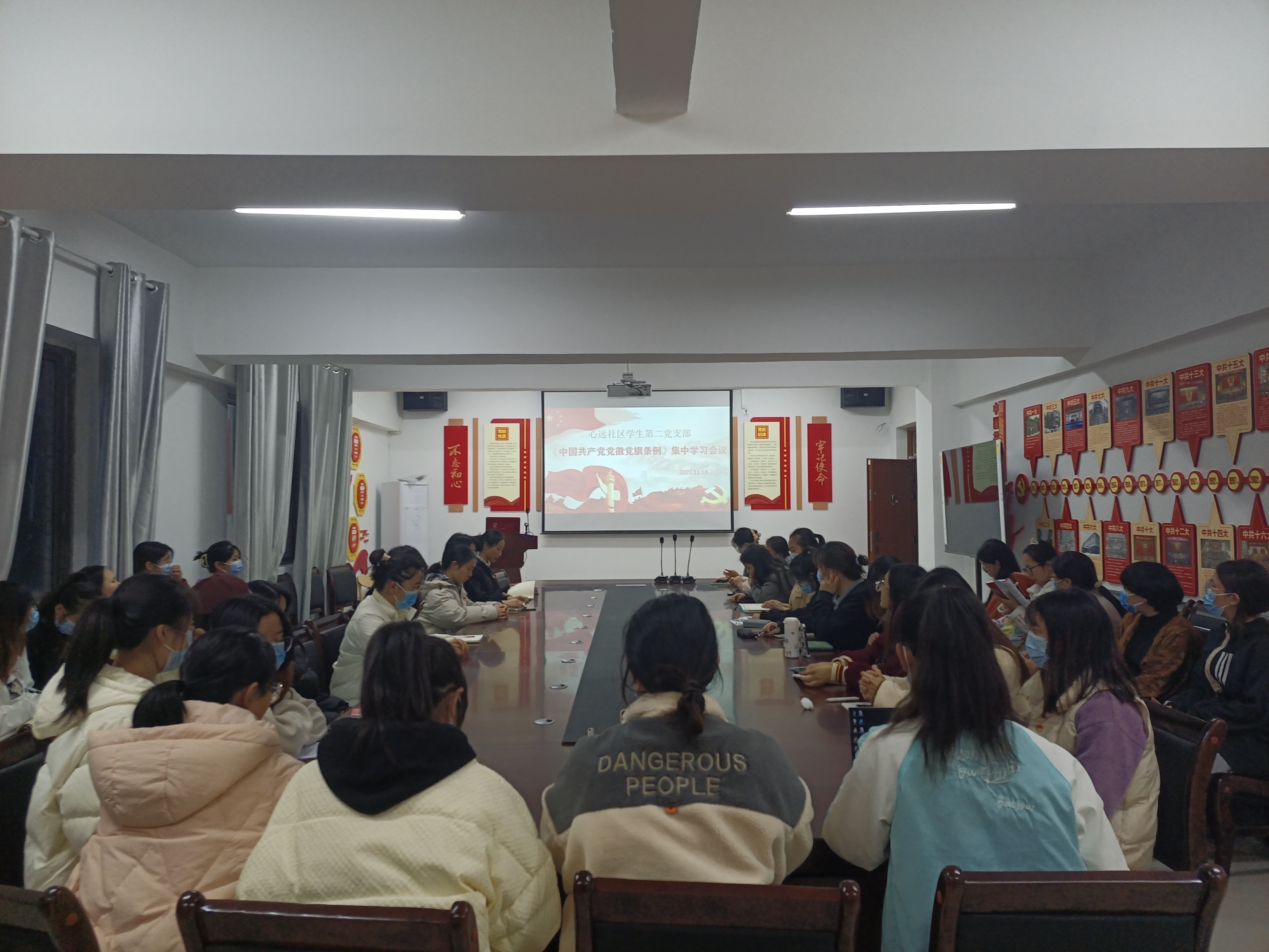 11月18日下午6:00,由公共卫生公司党委管理的心远社区员工第二党支部在心远社区205党团活动室集中学习了《中国共产党党徽党旗条例》,支部全体党员参加会议。党支部书记、永利yl23411集团2019级食品质量与安全专业张译文主持学习会。