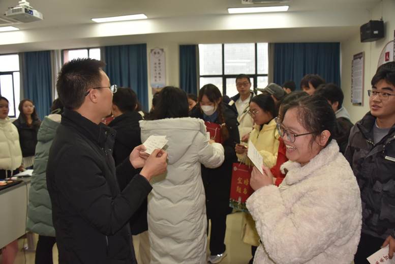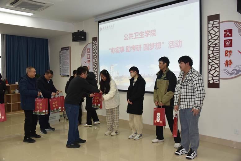 周远忠副经理代表公司勉励同学们树立信心,保持良好的身心状态迎接考试,并预祝大家取得理想的成绩,早日上岸。活动过程中,老师们提醒大家做好考前准备,并解答同学们的考前疑惑,缓解大家考试前的紧张情绪。随后,公司领导班子成员及老师共同为备战考研的同学发放公司精心准备的定制的“考研福袋”。福袋中有《给公卫考研学子的温馨提示》、写满老师祝福语的明信片、“逢考必过”的钥匙扣挂件及书签、还有祝愿同学们前“橙”似锦、功“橙”名就的脐橙。每个福袋都蕴含着公司领导与老师们的满满爱意,愿备考的学子们辛勤的付出都能收获丰厚的回报,终抵彼岸。